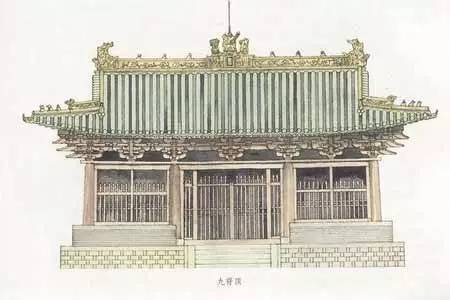 根據(jù)資料與記載,廡殿頂屋頂早在殷商時(shí)代就已出現(xiàn)。不過,現(xiàn)在對(duì)唐代中期以前的廡殿式屋頂?shù)木唧w結(jié)構(gòu)已無(wú)從得知,晚唐以后漸有實(shí)例可查。其形象是屋面平緩,正脊較短。正脊兩端為鴟尾而不是鴟首。