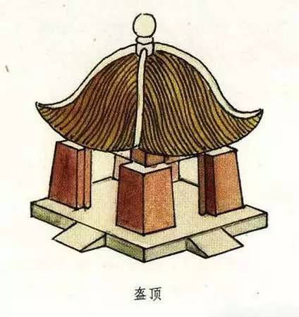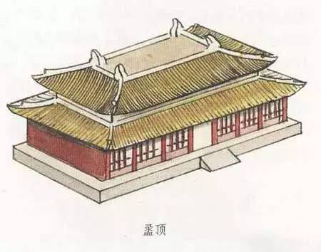 盝頂,是一種較為特別的屋頂形式。這種屋頂形式是在屋頂上有四條與屋檐平行的屋脊,四條屋脊構(gòu)成一個(gè)長(zhǎng)方形或正方形的平頂,其四角各有一條垂脊向下斜伸,共形成四塊坡檐。盝頂這種頂式在古代大型宮殿建筑中極為少見。