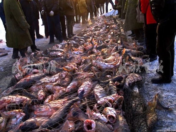 隨著“魚把頭”高亢的號子,馬拉人拽,一張幾千米長的大網(wǎng),被緩緩地拉出冰面。鯉魚、鯽魚、鰱魚、鯰魚等各種魚類一群一群翻上了冰眼。轉(zhuǎn)眼之間,冰面上堆起了一個個魚垛。