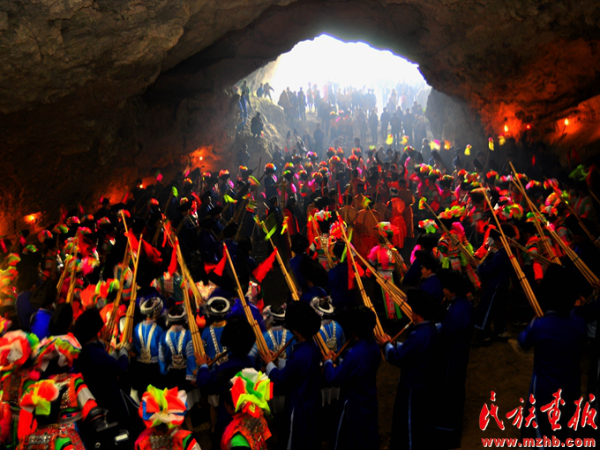 苗族同胞們身著節(jié)日盛裝,在溶洞里舉行“跳洞”,祭祀先祖,祈禱來年風(fēng)調(diào)雨順