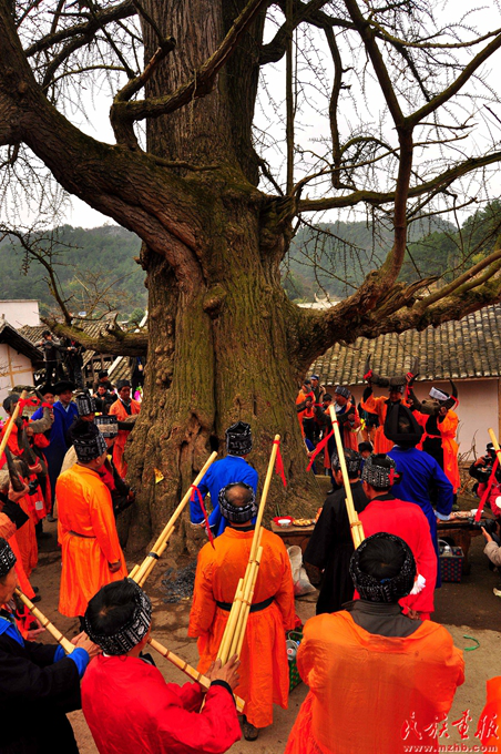 寨老引領(lǐng)眾人來到寨中央的千年銀杏樹下進(jìn)行祭樹,寨老高舉牛角、男人們吹起蘆笙圍著古樹轉(zhuǎn)圈,司儀唱起“古歌”祈禱