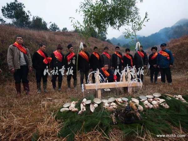 到招龍儀式活動點時,已是凌晨五點半,我們所在的位置是一個山腰,有一個小壩子。我發(fā)現(xiàn)參加儀式的只有十二三個人,就好奇地問:“為什么只來十多個人?”原來這些人是選出來的代表,該村有7個村民小組,共203戶,有980多人口,每次招龍大喜時,要從村民中推選出12位作為招龍代表,從頭到尾主持一切事務。說話間,村里人就開始忙著生火,或準備各項招龍工作。他們用木板支起一個擺放祭品的臺板,擺上祭品。接著,在招龍師傅的主持下,儀式正式開始。第一個程序是“喊白虎龍”,苗家稱為“共階夸羊捌”,師傅拿著一個白公雞,進行一番念誦后宰殺掉,等雞煮熟后再擺上祭臺。