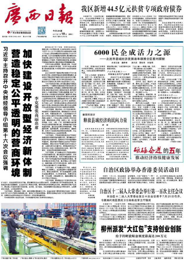 《廣西日報》(Guangxi Daily)作為中共廣西壯族自治區(qū)委員會機關報,以報道廣西重大新聞的權(quán)威性深得讀者看重,是廣西4800萬人民了解國家以及廣西重大時政、經(jīng)濟、社會信息的重要媒體,同時也成為外界觀察了解廣西的重要窗口。