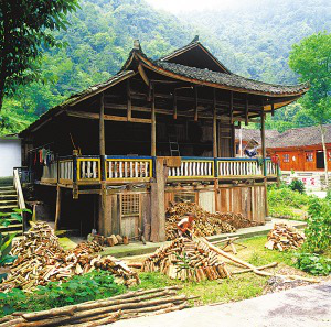 一般先建正房,再依經(jīng)濟條件和家庭需要續(xù)建吊腳樓。吊腳樓卯榫連接,結(jié)構(gòu)嚴謹,檐角伸展高翹,雕刻精美。底層有柱無壁,主要拴牲畜、堆放雜物,有的人家將廁所設(shè)在那里;二層以上為客房、書房、閨房,或是閨女專門做針線活的場所。木樓通風(fēng)干燥,四周設(shè)廊道,用椿木雕刻的花格欄桿可晾曬衣物。土家族的山歌唱出了吊角樓的氣勢:“土家起棟轉(zhuǎn)角樓,一截伸到天里頭,你若想要上天去,還要走段下坡路”。