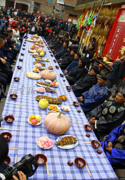 水族以大米為主食,喜愛糯食,此外,水族還種植一些小麥、包谷、小米、紅稗、紅薯及飯豆等雜糧作輔助糧。糯米飯是節(jié)慶主食,也用于祭祀,故又戲稱“鬼米”。水果有李、橙、橘、桃、梨和楊梅,還出產(chǎn)麥冬、杜仲等各種藥材。水族農(nóng)民不善種菜,因而蔬菜品種比較單調(diào),青菜、廣菜及大葉韭菜是最常見的蔬菜。水族比較重視養(yǎng)殖業(yè)和漁業(yè)。水族酸湯極有特色,有辣酸、毛辣酸、魚酸、臭酸等多種。極少有炒菜,一年四季都吃酸湯“火鍋”。即使偶有豆腐、肉或魚,也習(xí)慣加入菜中,煮成一鍋沾蘸水吃。吳茂釗《水族食俗點滴》一文指出,輪流坐莊就是熱情好客的文化表露。水族宴席上以雞、鴨、豬頭為尊,特別喜歡吃魚。水族特色飲食還包括水族特制的豬頭、豬腿、雞、鴨腿、糯米飯、粽粑、魚包韭菜、煮活魚等美食。對于水族人民而言,“吸煙重于喝茶,飲酒重于吃肉”。水族婚、喪、壽宴簡易,有“吃酸”的習(xí)俗(圖為水族節(jié)日盛宴。席間的“魚包韭菜”是祭祖儀式的必備之菜。引自民族畫報)。