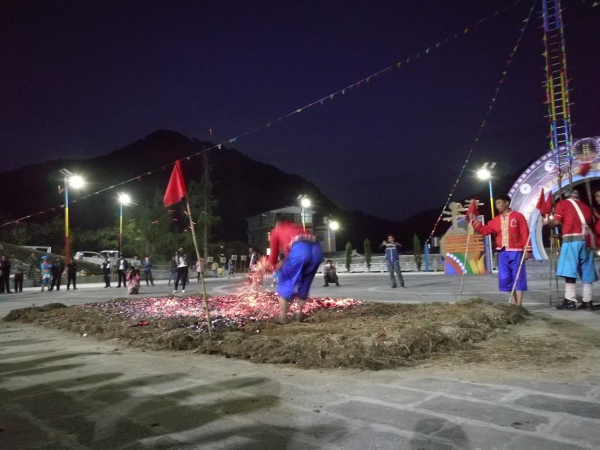 上刀山、下火海,是傈僳族民間的傳統(tǒng)民俗活動,是其傳統(tǒng)節(jié)日“刀桿節(jié)”上的主要表演項(xiàng)目。傈僳族的“刀桿節(jié)”源于一種原始的宗教活動。早期在“刀桿節(jié)”上表演上刀山、下火海的勇士們,都得聽命于巫師。上刀山、下火海之前,有一套繁瑣的宗教祭祀儀式。而且每個(gè)上刀山、下火海的勇士身上都要掛上幾十條巫師畫的符咒,使這一活動蒙上了濃厚的宗教色彩。經(jīng)過改革的傈僳族的“刀桿節(jié)”,一般于每年二月初八舉行,屆時(shí),上刀山、下火海就是表演的重要內(nèi)容。上刀山之前,人們首先豎起兩根20 多米長的筆直的松樹桿。在樹桿之間順序捆上36 或72 把鋒利的刀刃向上的鋼刀作梯子。表演開始后,表演者赤手光腳,蹬上梯子頂端,并要做些“蜻蜓倒立”“飛燕迎春”等高難動作。下了刀桿后,勇士們還要赤裸著上身、光著腳跳入熊熊烈火中,甚至用身體滾壓火海,直至炭火逐漸熄滅為止。此后,群眾性的娛樂活動就開始了,唱歌跳舞,呈現(xiàn)出節(jié)日的歡樂氣氛。上刀山、下火海,是經(jīng)過表演者長期的武術(shù)和氣功訓(xùn)練才能完成的。這一活動也表現(xiàn)出傈僳族人民機(jī)智、勇敢、知難而進(jìn)的優(yōu)良品質(zhì)。