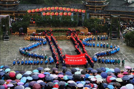 圖為(雷山達(dá)地水族鄉(xiāng))雨中表演水書 (原載中國網(wǎng)·中國民族) 引自民族畫報