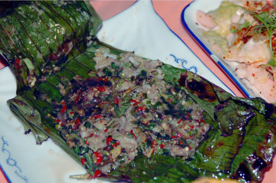 傣族傳統(tǒng)家常風(fēng)味菜,特點(diǎn)是軟嫩鮮甜,原汁原味。制法是將鮮魚去鰓和內(nèi)臟,洗凈,將蔥花、姜末、蒜末、青椒末、青姜葉末、芫荽末、野花椒葉末、薄荷、茴香葉末、香茅草葉末、草果粉、味精、鹽、料酒拌制成餡,裝入魚腹,頭尾折攏,再用香茅草捆成十字,外面包以芭蕉葉,埋入木柴燒后的炭或熱灰中燒熟,取出去掉芭蕉葉和香茅草,裝盤即成。