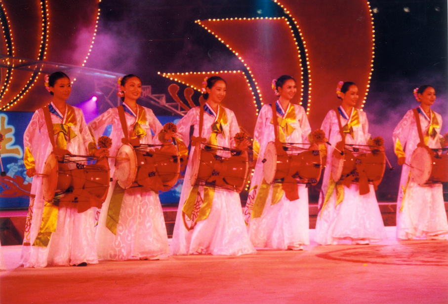 扇舞:表演者多為女性,需持花扇表演。源于古代巫女活動及民俗活動中的扇子表演,后發(fā)展成為單扇舞、雙扇舞兩種形式。扇舞有持一把或兩把扇具的不同形式,它具有朝鮮族特有的節(jié)奏、含而不露的內(nèi)在情緒、曲線性的律動和自由自在的表演,隨著隊(duì)形的不斷變化,舞者將手中的扇具可組合成豐富多樣的圖案和造型。