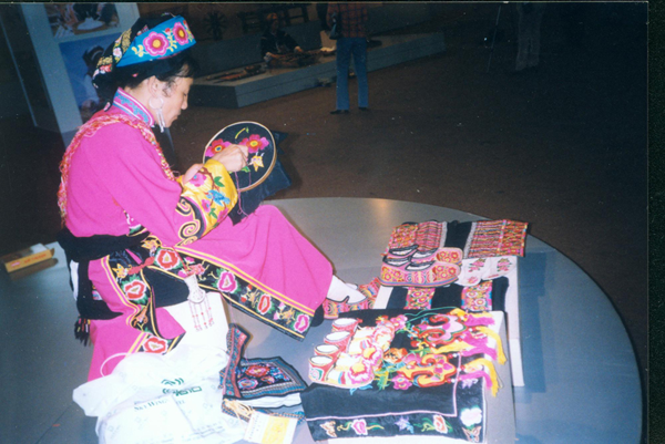 羌族傳統(tǒng)的民間工藝美術(shù)以挑花、刺繡最為出色。羌族姑娘從小就學(xué)習針線活,成年后都是女紅好手。刺繡時,無需草圖或畫線,心靈手巧的羌族婦女信手能刺繡成絢麗多彩的成品。挑繡時,以布的橫豎方格線為基準,采用挑、纖、扎、繡、勾、納、提、拼、扣等技法,單用或幾種并用,挑繡出來的幾乎都是栩栩如生的植物花卉、波浪等圖案。挑繡常用了頭帕、衣、褲、腰帶、鞋等易磨損處,既美觀又實用。一般煙荷包會繡兩種圖案,鴛鴦戲水和比翼雙飛,意在祈求男女雙方恩愛和諧。