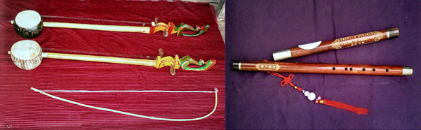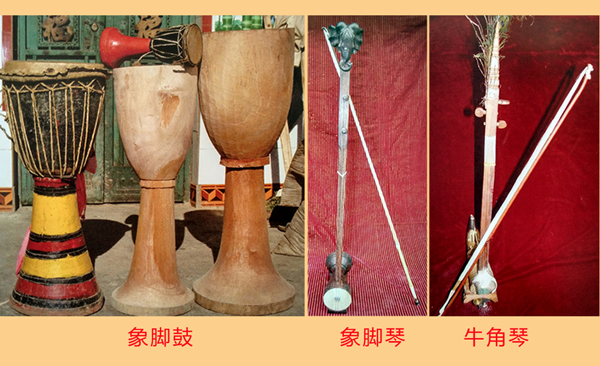 傣劇是在傣族民間歌曲和歌舞音樂的基礎上發(fā)展起來的,并借鑒了漢族戲曲藝術的表現(xiàn)手段,流傳于德宏、保山、臨滄等傣族聚居區(qū)。傣劇包括多種男女唱腔,男腔多用羽調式,女腔多用徵調式。20世紀50年代以來,傣劇吸收了多種傣族民歌和舞曲,豐富了唱腔,增強了音樂的表現(xiàn)力。傣劇唱腔基本是上下句組成的樂段及其變化反復。由于唱詞字數(shù)可多可少,因此唱腔樂句長短不一。過去,傣劇只用小堂鼓、鑼、镲等伴奏,后逐步采用了多種民族樂器及西洋管弦樂器,組成新型的傣劇樂隊。傣族的民族樂器屬于吹奏樂器的有篳、葫蘆簫(如圖)、豎笛、木葉等;彈撥樂器有玎琴、口弦等;弓弦樂器有西玎(玎琴)、牛角玎(牛角琴)等;打擊樂器有象腳鼓、光隆、光邊、光邦、鑼、镲等。象腳鼓、鑼、镲的合奏是傣族器樂合奏的主要形式。