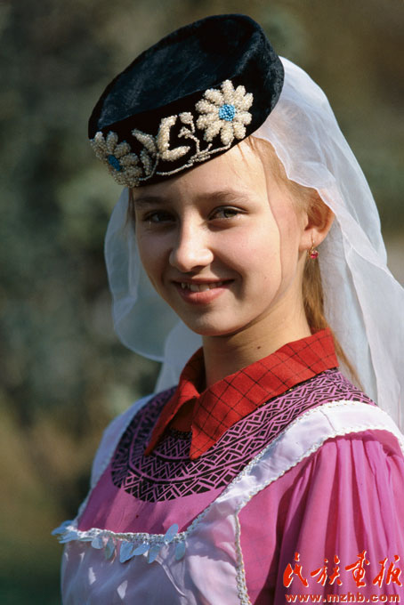 塔塔爾族的婚俗別具一格。按塔塔爾人的傳統(tǒng)習(xí)慣,婚禮在新娘家舉行,即先把新郎“嫁”出去,然后再“娶”回來(lái)。婚姻過(guò)程主要經(jīng)歷提親、相親、訂婚、納聘、嫁新郎、娶新娘六個(gè)過(guò)程(塔塔爾族少女。引自民族畫(huà)報(bào))。