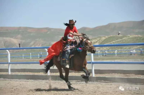 過去肅南裕固族自治縣西部地區(qū)的裕固族牧民大部分家里都放養(yǎng)駱駝,因此有賽駱駝的活動。賽駱駝主要是賽走駝和跑駝。走駝以走步穩(wěn)為上,騎駝?wù)呤殖质⑺耐?,看是否溢出;跑駝則以速度取勝,指定目的地,以先到達(dá)者為勝。