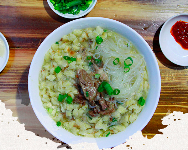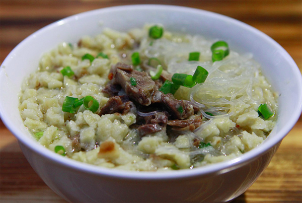 饃掰好后,請(qǐng)伙計(jì)呈給掌勺大廚,加羊肉湯大火快煮,加牛羊肉、粉絲、蔥花、蒜苗、香菜,優(yōu)質(zhì)的還有木耳、黃花菜和香干等即可端上來(lái)吃了。這樣一大碗自己親手掰好的泡饃,翠綠的蔥花、蒜苗、香菜、紅褐色的牛羊肉、黃色的金針菜、映襯著潔白晶瑩的粉絲、黝黑的木耳、香味四溢,。還應(yīng)注意的是:端上來(lái)的泡饃應(yīng)是泡饃墊底,粉絲覆成網(wǎng)形,佐以蔥花、香菜、牛羊肉擺成魚(yú)形在最上面,吃時(shí)左手拿勺,右手執(zhí)筷。泡饃上桌后,把辣子醬鋪在上面,切忌攪動(dòng),講究從一邊“蠶食”,以保持鮮味。糖蒜用否,個(gè)人自愿。餐后飲用一小碗原汁烹制而成的高湯,以為清口。