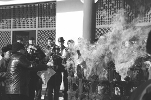 在主祭者的帶領(lǐng)下,男人們排隊(duì)走到火壇旁,一邊把自己帶來的白酒、黃油、羊肉等物恭敬地拋入火中,一邊禱告。按照傳統(tǒng),女人們?cè)谒谐绦蚨几嬉欢温鋾r(shí),最后走到火壇邊祭拜火神,祈福新春。