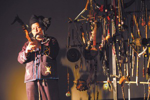 況且,《佤山古歌》并不是一場華麗的演出——演員的道具極其簡單,一些用木頭、動物毛等制成的樂器掛在一個木制的大架子上;演員的服裝并不艷麗,粗布制成的衣服、佤族一貫的“紅+黑”搭配。既然不在包裝上下功夫,也許有什么高科技看點,答案也是無,《佤山古歌》的設(shè)備只是一臺多媒體放映機(jī),能播放事先拍攝的影碟而已。