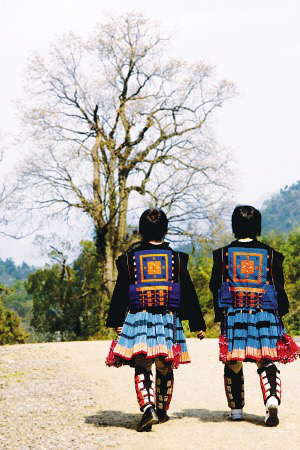 白褲瑤女人體態(tài)婀娜。這婀娜既來自于她們風(fēng)擺楊柳般的百褶裙,也來自身上前后兩片的夏衣。夏衣,黑色的調(diào)子,沒領(lǐng),沒袖,前面是一塊和肩膀?qū)挾认嗟鹊恼叫嗡夭?,后面則是用蠶絲布來制作的裙邊土布,上面繪滿了蠟染和花繡圖案。用漿染土布縫制成的百褶裙上,布滿了手繪而成的彩色圖案。其最復(fù)雜的工序,一是借粘膏樹汁憑空勾畫,二是用花線依著粘膏樹汁描過的隱約印痕,一點(diǎn)一點(diǎn)地挑繡出彩色圖紋來。做好一條裙子,往往需要花上女人們半年的時(shí)間。