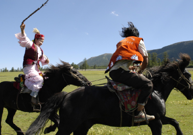 哈薩克族的傳統(tǒng)樂(lè)器可分為彈奏樂(lè)器、吹奏樂(lè)器以及打奏樂(lè)器。其中“冬不拉”、“薩孜”和“布特根”屬?gòu)椬鄻?lè)器;“斯伯孜俄”、“斯?fàn)柲且馈钡葘俅底鄻?lè)器;“達(dá)布拉”、“哈拉”等屬打奏樂(lè)器。無(wú)論是哪種類型的樂(lè)器無(wú)疑都將哈薩克族人民豪放灑脫,但又不失柔軟細(xì)膩的情感表現(xiàn)得淋漓盡致。哈薩克族的舞蹈剛健有力,瀟灑優(yōu)美,如“喀達(dá)卓日哈(黑走馬)”、“狗熊舞”、“鷹舞”、“擠奶舞”等都是反映哈薩克族人民日常生活的民族舞蹈。除歌曲、舞蹈以外,哈薩克族還有姑娘追、叼羊、賽馬等妙趣橫生的體育娛樂(lè)活動(dòng)。