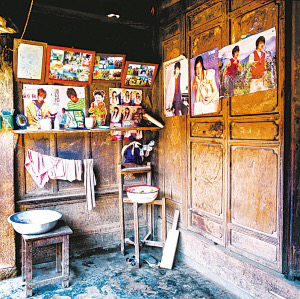 隴川縣戶(hù)撒鄉(xiāng)曼旦寨是阿昌族古老的村寨之一,明、清時(shí)期的老宅皆以楠木建造,數(shù)百年不朽、無(wú)蟲(chóng)蛀。受漢族文化影響,傳統(tǒng)民居大都是土木石結(jié)構(gòu)的三合一照壁或四合院落。正房建在長(zhǎng)方石條加土方壘起的屋基上,屋基下為院壩,以三層石階上下。正房三開(kāi)間,四排五柱,中柱起脊,形成雙斜面屋頂,上覆凹型青瓦。后墻和兩側(cè)山墻以土坯砌筑,外面不抹泥,左右是廂房或照壁。室內(nèi)隔墻均為木板,中間一間為堂屋,有一米多寬的吞口,六扇雕刻的木板門(mén),平時(shí)只開(kāi)中間兩扇。兩邊的檐柱頭有粗獷的木雕。吞口有走廊的作用,一般左側(cè)角設(shè)臉盆架以供洗漱,板壁上掛小鏡框以便梳妝,旁邊掛著家人的照片。有的擺著縫紉機(jī),有的放藤椅小憩。右側(cè)放臨時(shí)的農(nóng)具,掛衣服,板壁上貼著影視明星的招貼畫(huà)。堂屋正面板壁是通高的木雕佛龕,供奉佛像和傣文的經(jīng)文,龕楣上貼著三至四層掛錢(qián),下面有燭臺(tái)、香爐。左側(cè)擺著電視機(jī)、熱水瓶、茶桌,板壁上掛著戶(hù)撒刀和手工編織的背兜,右側(cè)有專(zhuān)供老人休息的床或藤椅,也有的砌火塘,火塘的小土臺(tái)上放著炒菜的調(diào)料、火柴和照明燈具。
