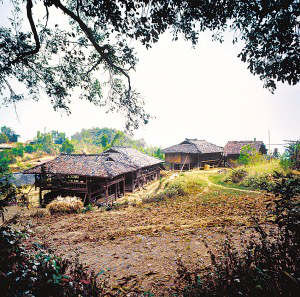 云南省潞西市三臺山鄉(xiāng)的德昂族居住分散,村寨很小,大都建在高半山上,山路行車?yán)щy。傳統(tǒng)住房為正方形干欄式竹木建筑,房屋兩層,為木柱結(jié)構(gòu)框架,竹篾編片圍墻,粗竹劈壓成自然的竹片做樓板,屋頂苫草排,當(dāng)?shù)厮追Q“草帽頂房?!?/p>