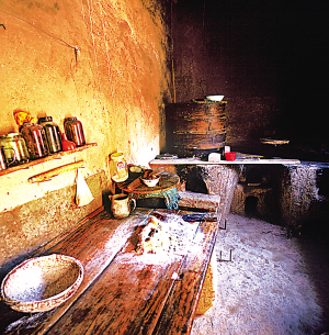 居室內(nèi)紅箱、畫柜耀人奪目,墻上掛有阿拉伯文字的對聯(lián)。屋檐下的臺階上,始終放著一個隨時洗手洗臉用的“湯瓶”,既節(jié)約又清潔。東西偏屋為晚輩居住,南邊為牲畜和草料房。東鄉(xiāng)人認為家居四方平正,財源廣,子孫榮,門庭興旺。廚房是獨立的,砌鍋灶,有大案板,方便以面食為主的飲食習(xí)慣。