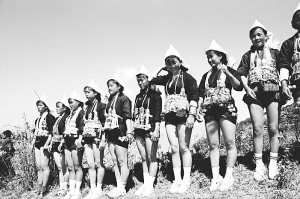 奕車姑娘的服飾很特別,衣服用機(jī)織的土染布制成,是藏青色的,配上銀飾后一下子生動(dòng)起來(lái)。銀飾圖案多為魚、鳥、螺螄和浮萍。我很奇怪,為什么會(huì)有浮萍?姑娘大方地說(shuō):“浮萍是田里的東西??!”奕車女子的帽子也別具一格:一頂尖頂?shù)陌撞伎p制的軟帽,布巾一直垂到背上,布巾尾邊用彩線繡著各種精美的花紋。帽子里面還有一根白線拴在發(fā)辮上,避免帽子被風(fēng)吹掉。這頂好看的白帽叫“帕?!保话氵€會(huì)有一頂圓形的篾帽戴在“帕?!鄙稀6齻兊姆椫?,最特別、最惹眼的還是那條只蓋過(guò)臀部、露出優(yōu)美的腿部曲線的緊身短褲。奕車女子一年四季都穿這種緊身短褲,剪裁十分講究,一般都是女子根據(jù)自己的身材特點(diǎn)自行剪裁的,以能緊束臀部為好。其別致之處在于短褲的前邊呈現(xiàn)出“人”字形的7道褶子,一眼看去,就好像有7條短褲穿在身上。