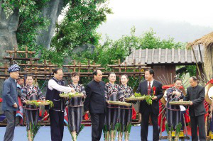 望謨布依寨老和小朋友迎接各位領導、朋友、嘉賓進入活動會場