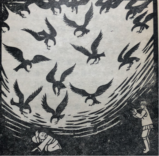 誰(shuí)知笛聲一響,成群的兀鷹像是聽了誰(shuí)的召喚,黑壓壓的一大片,直往奴隸主頭上飛來。奴隸主知道,只要鷹落下來,自己就沒命了,便急忙向娃發(fā)求饒道:“快把鷹叫開,你要啥我給啥!”娃發(fā)隨口說道:“給達(dá)卜達(dá)爾的塔吉克人每家十只羊,十頭牛,十峰駱駝,行嗎?”奴隸主連忙點(diǎn)頭:“行!行!要什么都給?!边@時(shí),娃發(fā)又吹起了“鷹笛”,鷹群才飛走了。
