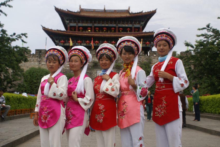 一直以來,享有“金花”美譽的白族婦女的服飾,更是色澤鮮美、絢麗多彩。大理一帶的婦女多穿白上衣、紅坎肩或是淺藍(lán)色上衣配絲絨黑坎肩,右衽結(jié)紐處掛“三須”“五須”的銀飾,腰間系有繡花飄帶,下著藍(lán)色寬褲,腳穿繡花的“白潔鞋”。手上多半戴紐絲銀鐲、戒指。已婚婦女梳發(fā)髻,未婚少女則垂辮或盤辮于頂,有的則用紅頭繩纏繞著發(fā)辮下的花頭巾,露出側(cè)邊飄動的雪白纓穗,點染出白族少女頭飾和發(fā)型所特有的風(fēng)韻。劍川一帶的年輕女子則又喜戴小帽或“魚尾帽”。洱源西山及保山地區(qū)的白族婦女常束發(fā)于頂,上插銀管,再以黑布包頭,穿右襟圓領(lǐng)長衣,系繡花腰帶,衣袖和褲腳喜鑲繡各色寬窄不同的花邊,有的還喜束護腿,顯得十分勻稱協(xié)調(diào)和俊俏美觀??傊?,各地白族的服飾雖呈現(xiàn)出某些地區(qū)性的差異,但都色彩明快、映襯協(xié)調(diào)、挑繡精美、古雅端莊。
