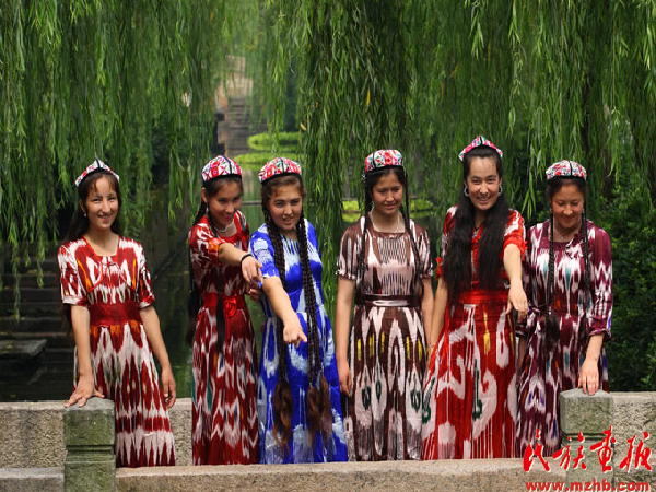 如果說(shuō)苗族服飾是苗族的一部“無(wú)字史書(shū)”的話,那新疆維吾爾族的艾德萊斯綢和小花帽則是維吾爾族熱情奔放性格的集中體現(xiàn)。艾德萊斯綢質(zhì)地柔軟,輕盈飄逸,非常適合縫制夏裝。按顏色分為黑艾德萊斯、紅艾德萊斯、黃艾德萊斯和多色艾德萊斯。紅艾德萊斯綢圖案為紅色,底色用黃色或白色,富于青春氣息,深受姑娘和少婦的喜愛(ài)。黃艾德萊斯綢圖案為黃色,在各種底色的襯托下顯得莊重而典雅,顯示一種富貴氣息,一般在制成中青年婦女服裝的時(shí)候使用。綠艾德萊斯綢多用來(lái)縫制學(xué)齡前兒童的女裝。維吾爾族無(wú)論男女老幼,不分春夏秋冬,都喜歡戴一種維吾爾族語(yǔ)稱為“朵巴”的小花帽,制作小花帽運(yùn)用絲線平繡、絲線結(jié)繡、串珠片繡、格子架繡、盤(pán)金銀繡、十字花繡、鉤花刺繡、扎絨刺繡以及刺、扎、串、盤(pán)等技法,將花卉果實(shí)等圖案匯集在帽子中,使小花帽的顏色豐富多彩。