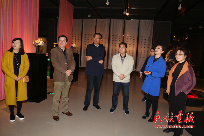 中國(guó)民族博物館館長(zhǎng)顧群(左三)、中國(guó)婦女兒童博物館副館長(zhǎng)劉華彬(右三)、中國(guó)民族博物館副館長(zhǎng)張志文(左二)、中國(guó)民族博物館副館長(zhǎng)鄭茜(右一)等嘉賓參觀展覽