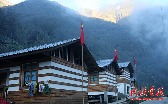 國家大力支持發(fā)展獨(dú)龍族社會(huì)事業(yè),真正為獨(dú)龍族百姓謀福利。獨(dú)龍族居民房屋前,家家掛著鮮艷的五星紅旗
