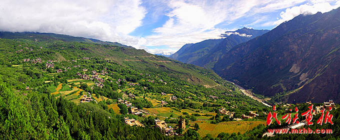 甘孜州東部的丹巴山寨體現(xiàn)了天人合一的理念,遠(yuǎn)遠(yuǎn)看去,充滿靈氣的山谷中,翡翠般的青草綠樹之中,是那沉甸甸的田地和隱在密林深處的寨房,伴著時(shí)有時(shí)無的潺潺溪流,一幅富有動感的絕妙山寨畫卷隨之展示在你的眼前(民族畫報(bào)資料)