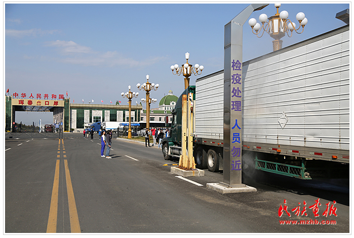 不斷有旅游大巴和貨車從琿春口岸駛過(guò)。圖為準(zhǔn)備入境中國(guó)的俄羅斯大貨車做檢疫處理