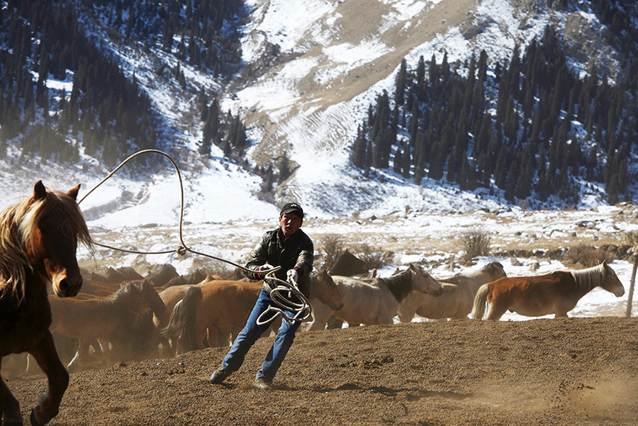 我首先到訪的是達楞達坂一帶。接待我的主人卡瑪儀表堂堂,60多歲還在照料自家的畜群。老人沒有興趣放羊,每天吆著100多匹馬和300頭牦牛在日月間往復(fù)。一望無際的雪原,把暴烈的馬群和野性難馴的牦牛吆往一個地方或再吆回去,騎馬的強度與奔跑的頻率遠不是他這個年紀(jì)的人所能駕馭的了。但老人不這么想,他不愿意在和靜縣城的暖氣房子里喝茶陪孫子們,而更愿意在他的馬背上,每天奔波在雪原上。
