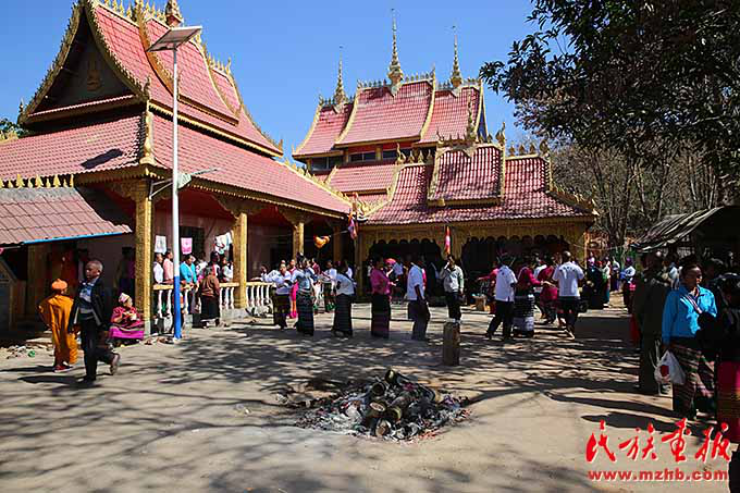 生活在我國(guó)西南邊疆的布朗族節(jié)日期間要舉行很多文化活動(dòng),布朗族同胞與親朋好友相聚一堂,品嘗美味佳肴并舉行歌舞表演。臨近中午,位于曼夕村前山頂?shù)乃聫R已人頭涌動(dòng),院子里人們圍成圈邊打鼓邊跳舞,緩緩移動(dòng)的優(yōu)美舞姿成為一道靚麗的風(fēng)景。
