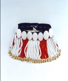 民族文化宮博物館收藏的這件傈僳族綴彩珠女子“歐勒”帽,于上世紀70年代征集于云南省怒江地區(qū)。整個頭飾直徑16厘米、重534克,質(zhì)地為琉璃質(zhì)、銅質(zhì)和海貝。帽身墜有24條紅珠、38條白珠,珠體直徑約0.5厘米,紅白珠串相間分布,每組珠串下墜有金色銅鈴,共29個,環(huán)繞整個帽身排列縫綴16個直徑約3厘米左右的白色海貝片。整個“歐勒”帽色彩鮮艷,制作精美,佩戴起來襯托得傈僳族女子光鮮亮麗、風(fēng)姿綽約。