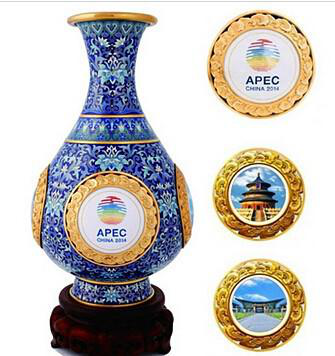 2014年APEC會(huì)議中,作為國禮饋贈(zèng)給各經(jīng)濟(jì)體領(lǐng)導(dǎo)人的三件禮品中就有一件采用景泰藍(lán)工藝,以藏于北京故宮博物院的霽紅釉玉壺春瓶為原型,由中國七位國家級(jí)、北京市工藝美術(shù)大師聯(lián)手創(chuàng)作的《四海升平》景泰藍(lán)賞瓶。