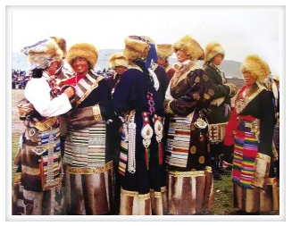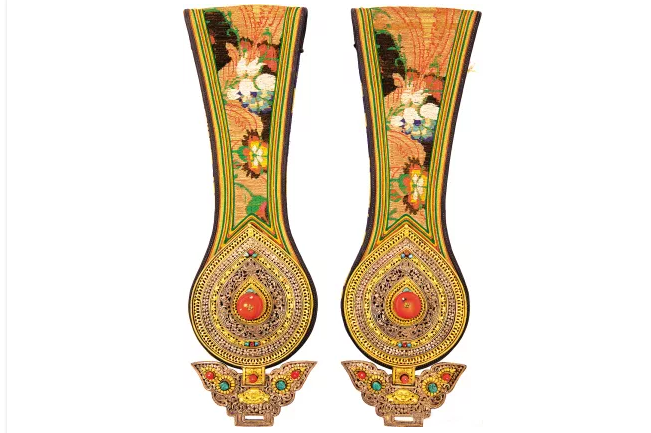 邦典,漢語稱作圍裙或圍腰,是藏族婦女不可或缺的飾品之一。從字面上理解,“邦”在藏語里是“懷”的意思,“典”是“墊”的意思,“邦典”就是保護(hù)藏袍腰部以下部位的墊子。邦典由色條氆氌制成,這是一種藏族聚居區(qū)特有的羊毛織物,工藝精密細(xì)致,配色熱烈明快且過渡巧妙。系上邦典,再佩上各色銀飾、珠寶,宛若彩虹加身,氣派非凡。