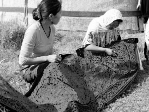 秋來春往,花落花開,瑪利亞從小女孩長成大姑娘,她的繡藝也日漸嫻熟,結(jié)繡、鉤繡、扎繡、刺繡、串珠片繡、格子架繡、十字繡……在日復(fù)一日的飛針走線中,她練就了一雙巧手和溫柔內(nèi)斂的性格。瑪利亞繡花,先勾勒花朵的輪廓,再用細的色線填滿輪廓內(nèi)的空間,由外向內(nèi),一圈一圈、一層一層,直到色彩飽滿的圖案凸現(xiàn)出來。草原上黃色的野菊、白色的蒲公英、藍色的薰衣草、紅色的刺玫,都像被擷取了精靈似的,綻放在柯爾克孜女人的繡品中,流露出她們與自然界溫暖而平和的情感交流。