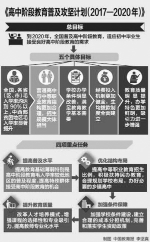 “高中教育是選擇性教育,僅僅提供學位,缺乏吸引力,學生不愿意上,普及目標就難以實現(xiàn)?!苯逃肯嚓P(guān)負責人解釋說,在確保普及程度的基礎(chǔ)上,要體現(xiàn)全面科學的普及觀,防止簡單追求數(shù)量和規(guī)模的增加。因此,除了2020年我國高中階段教育毛入學率將要達到90%這個總目標外,《攻堅計劃》還提出了5個具體目標:
