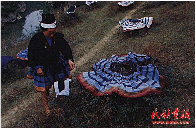 畫(huà)好的白布放進(jìn)盛有牛膠和藍(lán)靛的缸里浸染7— 10天,當(dāng)布匹染成深藍(lán)色時(shí)拿出,再放入盛有草木灰的熱水中,用灰水將粘膏脫去,清水洗凈后晾干,就成了一塊有白色花紋的蠟染布。白褲瑤婦女在白色的花紋上繡上彩色的絲線,再把三幅繡有圖案的布連成一塊4米長(zhǎng)的裙布,在裙腳邊上縫上一條手掌寬的黃色蠶絲,最后用2 條棉繩穿過(guò)裙頭勒緊,百褶裙就做成了。一條百褶裙從紡線到完成據(jù)說(shuō)需要兩到三年的時(shí)間。
