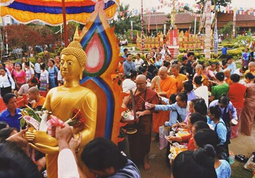 新年潑水是一種禮節(jié),既隆重又熱鬧。除夕那天,人們先到佛寺里,取來(lái)最干凈的清泉(江河)水,采來(lái)最香的鮮花,把花瓣撒在水中,每人取一瓢,用含著花香的清水給佛像沐?。ㄏ笳鹘o佛祖沐?。砬髞?lái)年平安。儀式舉行完后,人們用樹枝和鮮花浸水相互淋灑,以示祝福,口中不斷地說(shuō)著“薩瓦沙麗”(吉祥安康)“如利京宛”(幸福健康)。對(duì)長(zhǎng)者只能輕輕地淋灑在肩和背上,表示尊重。到佛寺外和街上,年輕人們就可以潑水狂歡,以示祝福和歡樂(lè)。