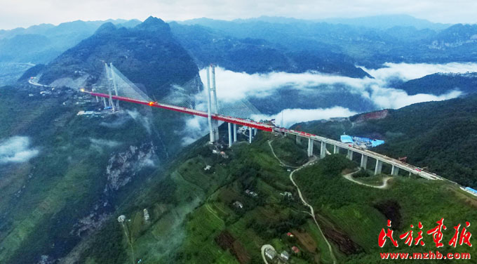 我國東西橫線大通道杭瑞國家高速公路的關(guān)鍵節(jié)點——畢節(jié)至都格高速公路北盤江大橋。該橋橋面到谷底垂直高度達569.66米,為世界第一高(鄧剛 攝影)