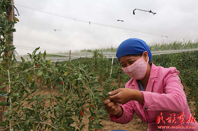 楊彩梅的二兒媳在摘枸杞,這里種植枸杞是農(nóng)戶增收的一大來源(曾穎 攝影)