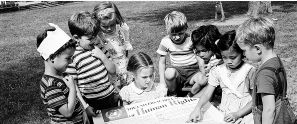 1950年,聯(lián)合國國際育童學校的孩子們在閱讀第一張《世界人權(quán)宣言》的海報。
