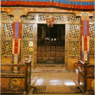 大門由于它的位置所在不應(yīng)該列入室內(nèi)裝飾,但它與室內(nèi)裝飾息息相關(guān),連成一體,故我們把它當(dāng)作室內(nèi)裝飾在這兒加以介紹。門框裝飾包含門框本身、門楣、門楣上的屋檐、門板等。藏族建筑大門裝飾十分講究,從屋檐到門坎都用雕、繪的手段充分加以裝飾。屋檐用兩道方本間隔排列,上蓋青石片和黃土筑成底小頭大的形狀,它不僅有美觀的裝飾效果,而且起到防水作用。屋檐下是門楣,門楣上彩繪各種圖案,門框的木構(gòu)件上雕刻蓮花花瓣和累卷疊函凹凸方格圖案,這種圖案處理形式大部分民居大門大同小異。門板為單開式,板門為了加固起見上、下分層釘鐵條。門板一般涂單一色,不作繪畫處理。除了這些裝飾以外,門相上掛短縐簾,門框左右邊緣墻上涂兩道黑色豎條,每年過年前短縐簾要棄舊換新,黑色豎條與粉刷外墻一道重新涂漆,這是一般民居門框裝飾。寺廟門框裝飾較為復(fù)雜,門楣的間隔方木上加一層雕刻動(dòng)物頭像的木雕作品排成一行,裝飾門楣這一板塊,門框木構(gòu)件多則六、七層,層層雕刻各種圖案,可見其講究程度。寺廟門板大多是對開式,用鐵條包裝門邊緣,中間分層釘鐵條,涂一層單一的顏色,特殊殿堂如擴(kuò)法神殿大門門板上要進(jìn)行繪畫處理,寺廟大門講究厚重、莊嚴(yán)。無論是民居大門還是寺廟大門,其裝飾要求與室內(nèi)梁柱裝飾相協(xié)調(diào),從顏色的運(yùn)用到雕刻內(nèi)容都要做到這一點(diǎn),保持內(nèi)外裝飾效果統(tǒng)一。