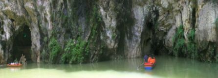 水洞長(zhǎng)1000余米,半是人工半天然,登舟入洞,借助稀疏的燈光和導(dǎo)游的手電筒辨認(rèn)著一處一處各各不同的景物,頗有一點(diǎn)神秘之感。洞盡船出,豁然開(kāi)朗,但見(jiàn)茂竹修篁叢叢簇簇,一泓綠水微波不興,野趣天成,靜謐無(wú)聲,此處名“竹林翠溪”,宛如一世外桃源。旱洞共三層,滿布著形態(tài)各異的石鐘乳、石筍、石柱、石幔,其第三層洞廳軒敞,一座天然石橋飛架兩懸崖間,人稱(chēng)“奈何橋”,橋下即是深不可測(cè)的陰潭,景觀之奇特,令人叫絕。旱洞出口處,有苗寨一座,是專(zhuān)為旅游者興建的,游人盡可在此親身體驗(yàn)一次苗家的婚俗。