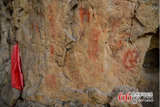 同時,在金山洞壁上的清代壁題也數(shù)量眾多,既有題詩,又有紀(jì)事,還有祝文,分別題于清乾隆、道光、咸豐年間。明顯可見“貴州貴陽府”和“貴陽府廣順州”等字樣。還有1949年以后的毛主席語錄,均以赭色書寫。據(jù)說時至今日,仍有村民在巖下洞口焚香秉燭,寄拜巖神,祈禱康健?,F(xiàn)在在巖石上還能看到祈福的紅布和被煙火熏黑的巖洞。