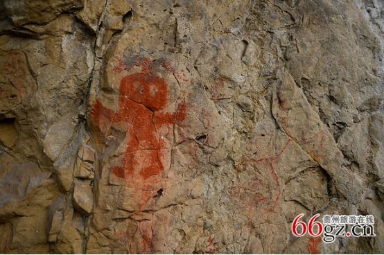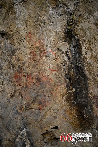 據(jù)資料載,金山洞古代崖畫以赭色涂繪人、馬、狗等等,隱約可見形態(tài)各異的大小圖像二三十個。人物多作行走狀,亦有雙手高舉者,似乎在祈禱。從其畫風(fēng)觀察,與相距不遠(yuǎn)的省級文物保護單位--長順龍家院崖畫十分相似。